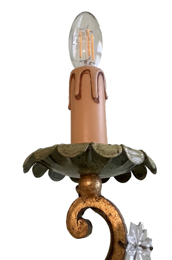 The chandelier and sconces are made of gold-plated metal, which not only creates a warm, luxurious radiance but also has the ability to reflect light in a magical way. Each of the six arms, which elegantly branch out in different directions, is adorned with intricate decorations reminiscent of lush leaves, delicate flowers, and sparkling pearls. These elements not only lend the lamp visual appeal but also speak of the Florentine tradition of drawing inspiration from nature and celebrating the beauty of life.