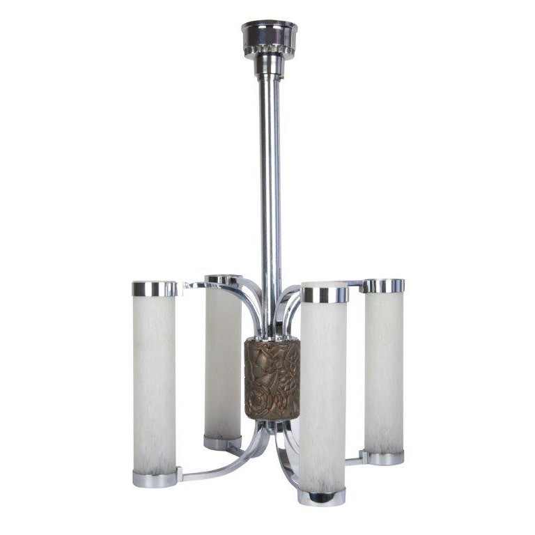 Petitot’s works were heavily influenced by Art Deco, a style popular in the 1920s and 1930s. It is characterized by its geometric shapes, symmetrical patterns, and luxurious materials. He frequently used materials such as glass, chrome, and brass to create elegant and modern lighting solutions. His designs were both functional and decorative. They found application in numerous residential, public, and commercial spaces.