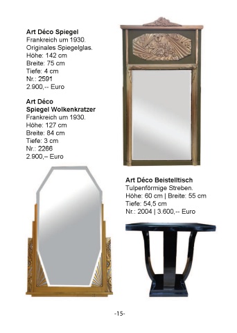 -15-Art D%u00e9co SpiegelFrankreich um 1930. Originales Spiegelglas. H%u00f6he: 142 cmBreite: 75 cmTiefe: 4 cmNr.: 25912.900,-- EuroArt D%u00e9co Spiegel WolkenkratzerFrankreich um 1930.H%u00f6he: 127 cmBreite: 84 cmTiefe: 3 cmNr.: 22662.900,%u2013 EuroArt D%u00e9co BeistelltischTulpenf%u00f6rmige Streben.H%u00f6he: 60 cm | Breite: 55 cm Tiefe: 54,5 cmNr.: 2004 | 3.600,-- Euro