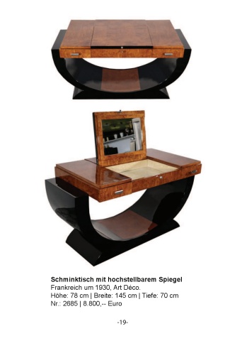 -19-Schminktisch mit hochstellbarem SpiegelFrankreich um 1930, Art D%u00e9co.H%u00f6he: 78 cm | Breite: 145 cm | Tiefe: 70 cmNr.: 2685 | 8.800,-- Euro