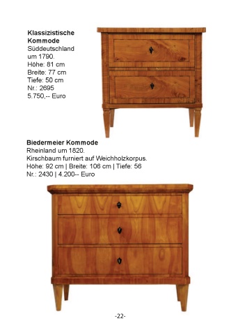 -22-Biedermeier KommodeRheinland um 1820. Kirschbaum furniert auf Weichholzkorpus. H%u00f6he: 92 cm | Breite: 106 cm | Tiefe: 56 Nr.: 2430 | 4.200-- EuroKlassizistische KommodeS%u00fcddeutschland um 1790.H%u00f6he: 81 cm Breite: 77 cm Tiefe: 50 cmNr.: 26955.750,-- Euro