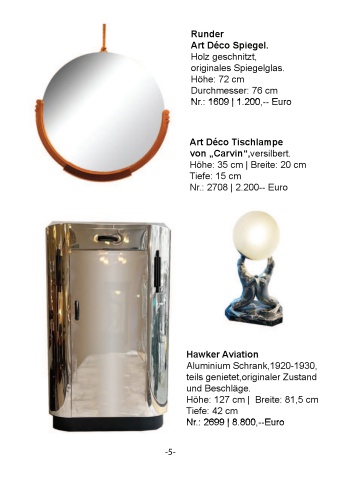 Art D%u00e9co Tischlampe von %u201eCarvin%u201c,versilbert. H%u00f6he: 35 cm | Breite: 20 cm Tiefe: 15 cmNr.: 2708 | 2.200-- EuroRunder Art D%u00e9co Spiegel.Holz geschnitzt,originales Spiegelglas.H%u00f6he: 72 cmDurchmesser: 76 cmNr.: 1609 | 1.200,-- EuroHawker AviationAluminium Schrank,1920-1930, teils genietet,originaler Zustand und Beschl%u00e4ge.H%u00f6he: 127 cm | Breite: 81,5 cm Tiefe: 42 cmNr.: 2699 | 8.800,--Euro-5-