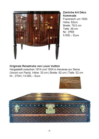 Originale Reisetruhe von Louis VuittonHergestellt zwischen 1914 und 1924 in Asnieres sur Seine.(Vorort von Paris). H%u00f6he: 33 cm | Breite: 92 cm | Tiefe: 52 cm Nr.: 2704 | 13.000,-- Euro Zierliche Art D%u00e9co KommodeFrankreich um 1930.H%u00f6he: 82cmBreite: 79,5 cmTiefe: 39 cmNr.: 27025.500,-- Euro-7-