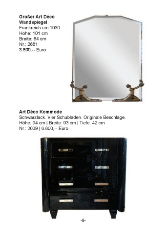 -8-Gro%u00dfer Art D%u00e9co WandspiegelFrankreich um 1930.H%u00f6he: 101 cmBreite: 84 cmNr.: 26813.800,-- EuroArt D%u00e9co KommodeSchwarzlack. Vier Schubladen. Originale Beschl%u00e4ge. H%u00f6he: 94 cm | Breite: 93 cm | Tiefe: 42 cmNr.: 2639 | 6.800,-- Euro