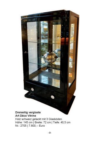 Dreiseitig verglaste Art D%u00e9co Vitrine Holz schwarz gelackt mit 3 Glasb%u00f6den.H%u00f6he: 145 cm | Breite: 72 cm | Tiefe: 40,5 cmNr.: 2705 | 7.800,-- Euro-9-